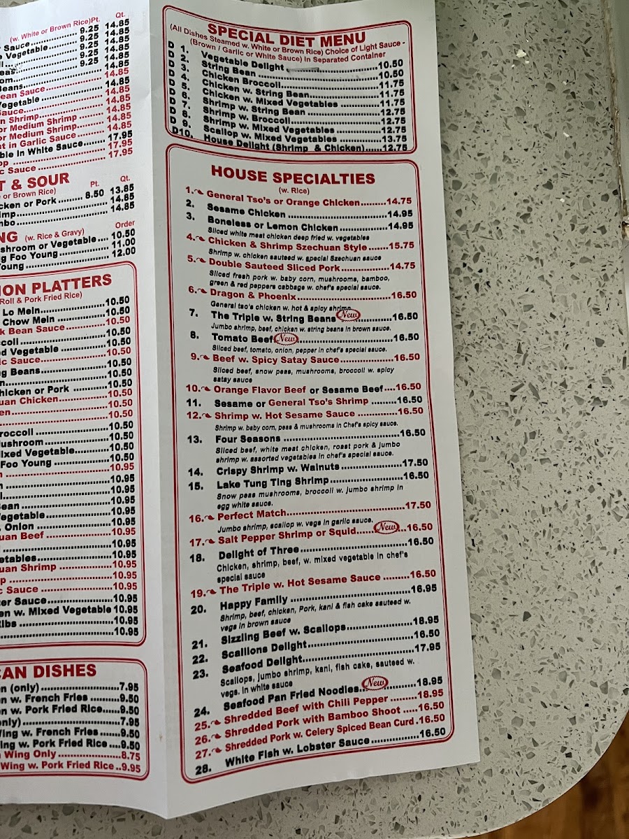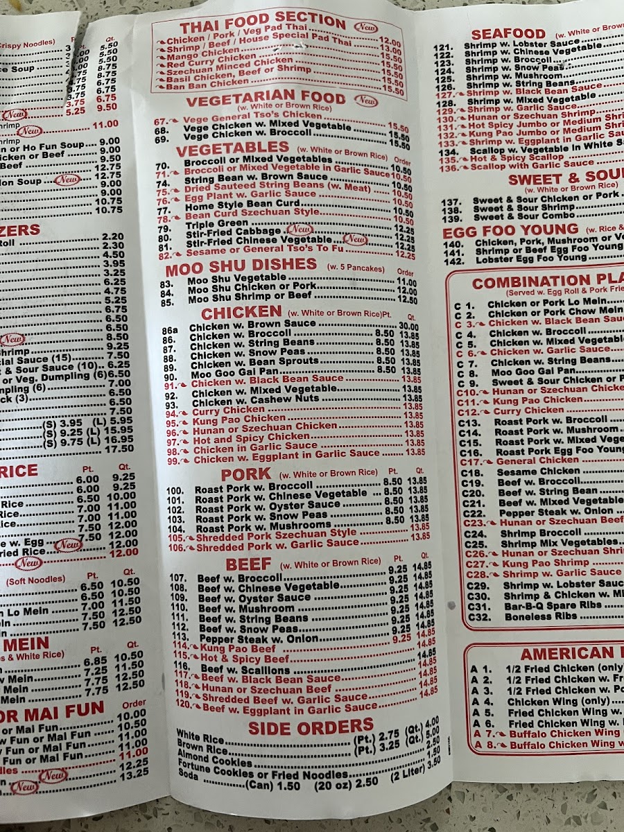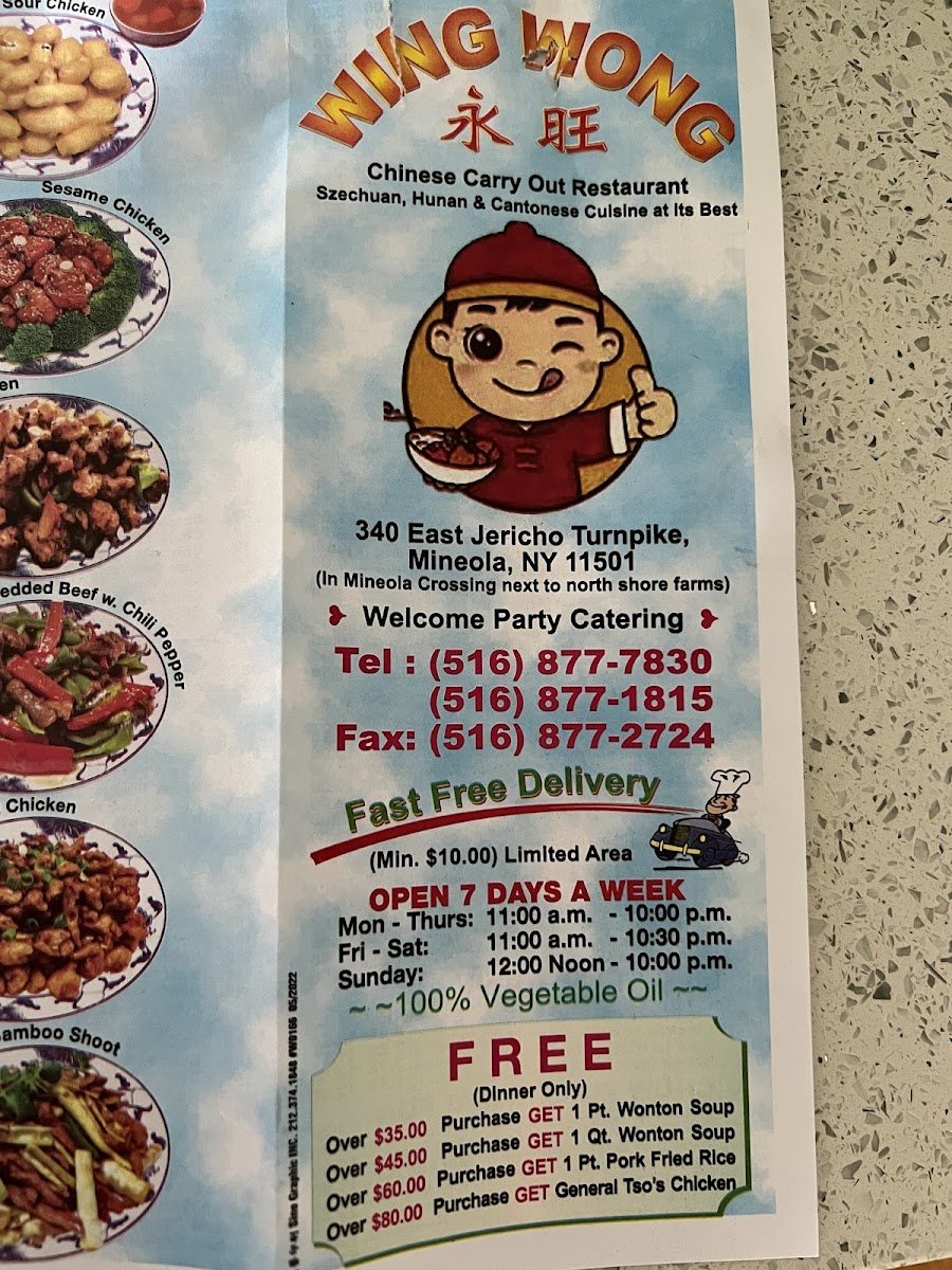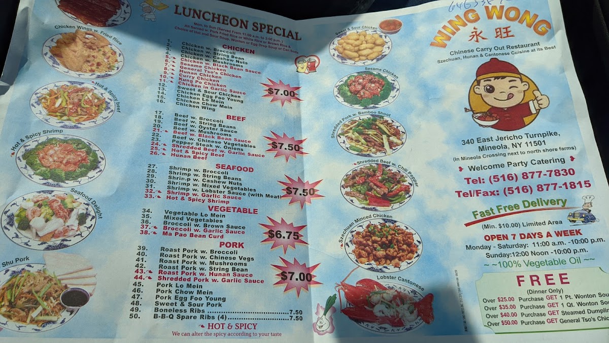 Wing Wong Kitchen offers a diverse and extensive menu, catering to a variety of tastes with both traditional and unique options. For soup lovers, the Wonton Soup and Egg Drop Soup are popular choices, with the Wonton Egg Drop Mix Soup providing a delightful combination. Appetizers like Egg Roll and Duck Spring Roll set the stage for a satisfying meal. Their fried rice options, including Vegetable Fried Rice and Shrimp Fried Rice, pair well with entrees. The lo mein selection offers classics such as Chicken Lo Mein and Beef Lo Mein, while the chow mein options, like Shrimp Chow Mein and Pork Chow Mein, deliver great variety. Vegetables are well represented with dishes such as Broccoli in Garlic Sauce and Mixed Vegetables in Garlic Sauce. For vegetarian choices, the Vege General Tso's Chicken and Vege Chicken in Garlic Sauce provide satisfying meatless options. The menu also offers a variety of chicken, pork, beef, and seafood dishes, with favorites like Chicken With Broccoli, Roast Pork With Mushrooms, and Shrimp With Lobster Sauce. The Moo Shu options, like Moo Shu Pork and Moo Shu Shrimp, are flavorful and filling. For those craving something sweeter, the Sweet & Sour Chicken and Sweet & Sour Shrimp are excellent picks. The Egg Foo Young and Combination Platters add to the variety, with dishes like Chicken With Cashew Nuts and Pork Egg Foo Young. For a touch of Thai cuisine, try the Chicken Pad Thai or Shrimp Pad Thai. American comfort food is also available, with options like 1/2 Fried Chicken and Chicken Wings With French Fries. Special diet options, such as Steamed Vegetable Delight, cater to lighter preferences. House specialties, like General Tso's Chicken and Orange Chicken, round out the diverse menu, ensuring there's something for everyone.
